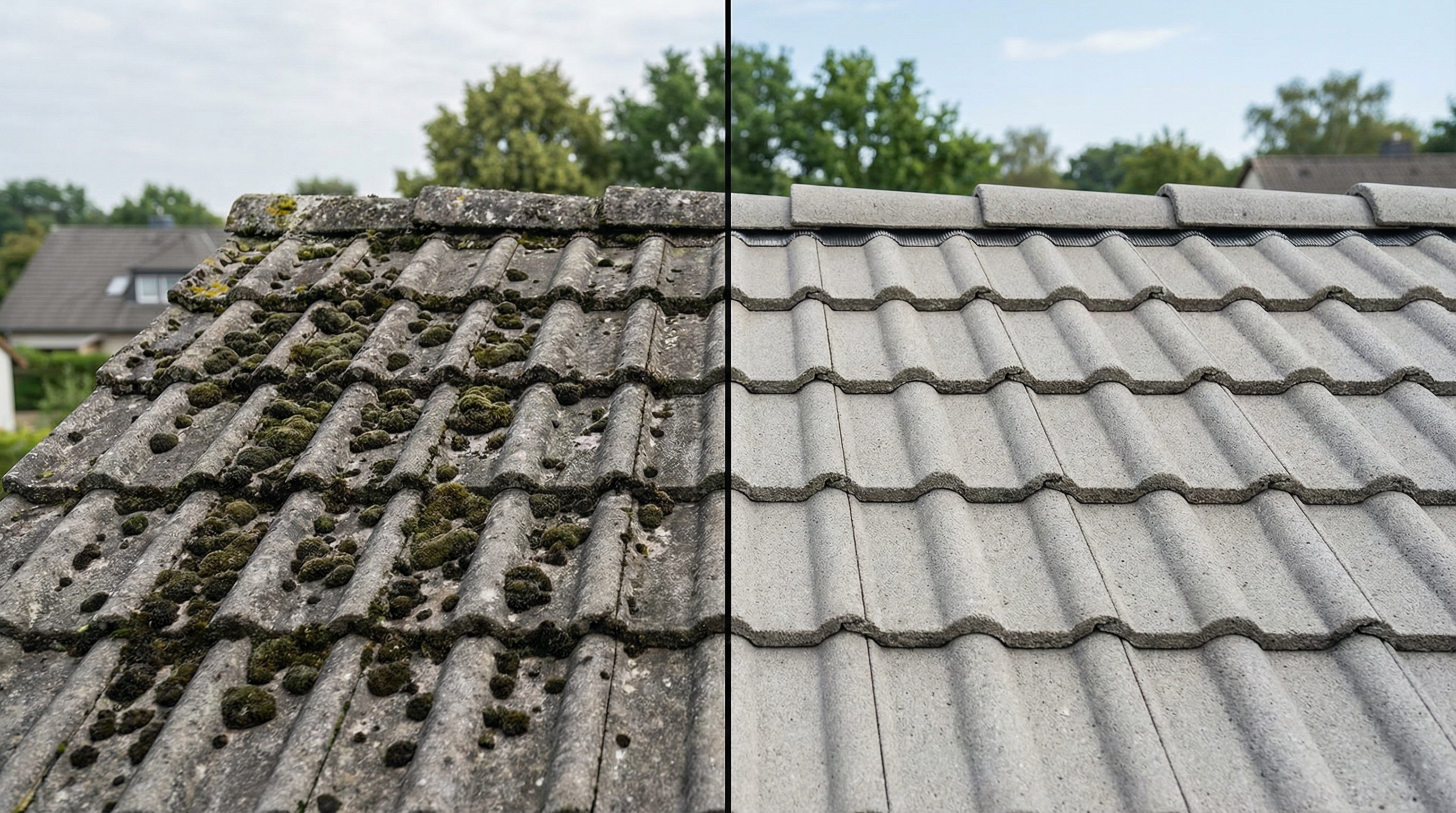 Betondachstein (Frankfurter Pfanne) – Vorher mit starkem Moosbefall, nachher sauber und geschützt